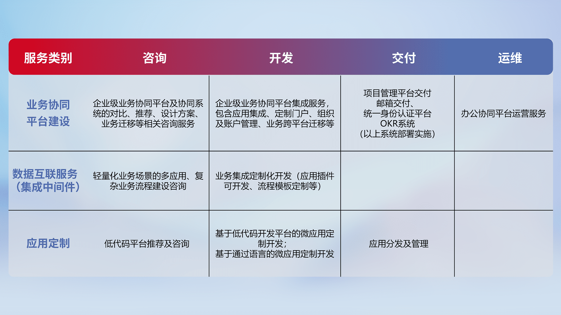 针对钉钉、、、企微、、、IDaas等平台级产品提供产品的规划、、方案、、、、交付、、定制化开发等服务,,,实现如统一协同办公、、、智能客户服务、、、、混合会议管理、、、、智能数据查询、、等业务场景,,,实现数字化转型。。。。