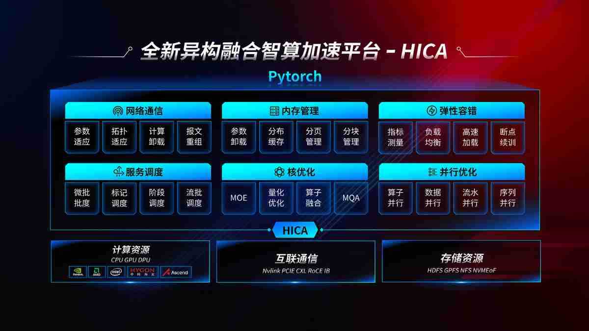 通过自研的服务层、、中间适配层、、以及调度编排算法,,,,采用数据并行、、模型并行等多种并行方式,,,,把并行计算任务进行有效的分解,,,,使其分别由相应的软件栈和算力资源来承接。。。当GPU资源变化,,,HICA可以实时动态调度计算子任务并调整模型拓扑和架构,,以充分聚合各种算力资源。。。